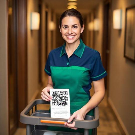 1) Guests scan a QR on a receipt, table tent, badge or room card.